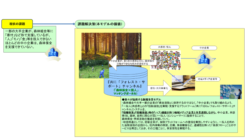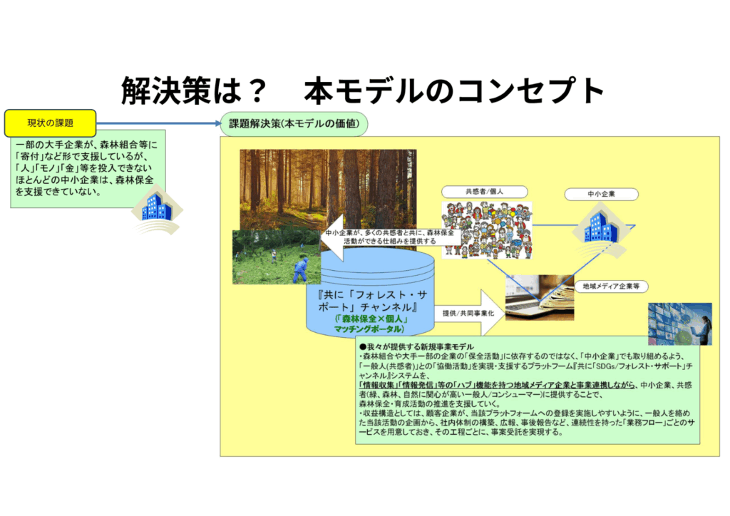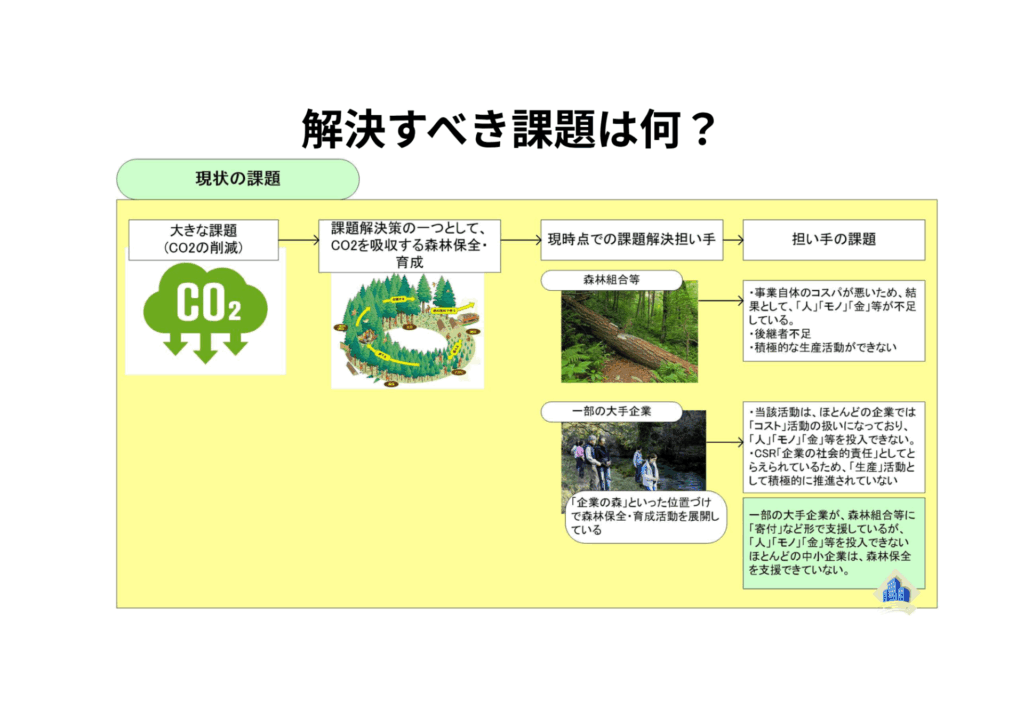 - そこで、我々が考えたのは、企業(とりわけ、中小企業)と一般市民と、森林関係者を結びつける仕組み作りです。